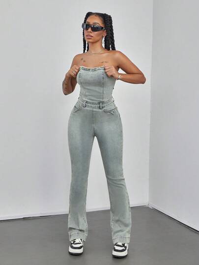 复古后拉链吊带牛仔连体裤,休闲装 - 淺色水洗藍 - 查看 5