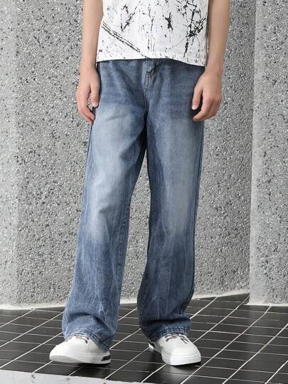 复古时尚百搭设计直筒牛仔裤 - 中等水洗藍 - 查看 1