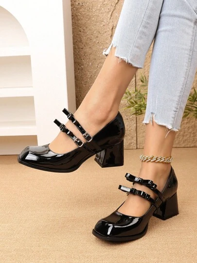 复古法式玛丽珍鞋女新款春季高跟鞋韩版小皮鞋纯色迷人公主优雅方头粗跟高跟鞋 - 黑色 - 查看 1