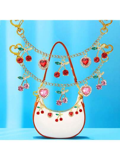 水钻心形和樱桃形包包链饰物 心形和樱桃形包包链饰物 金色装饰包包链饰物 钱包延长器 钱包链带替换包装饰链饰物 女士配饰 单肩包 手提包 腋下包 生日及节日 情人节 圣诞礼物