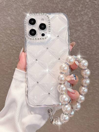镶钻菱形奢华透明手机壳,带腕带,兼容 16 Pro Max/16/16 Pro/16 Plus/16E/15/15 Pro Max/15 Pro/15 Plus/11/12/13/14 Pro Max/11 Pro/11 Pro Max/12 Pro/12 Pro Max/13 Pro/13 Pro Max/7 Plus/14 Pro/14 Pro Max/14 Plus,简约创意白色软壳,防水防震防摔防刮。 - 透明+珍珠腕帶 - 查看 3