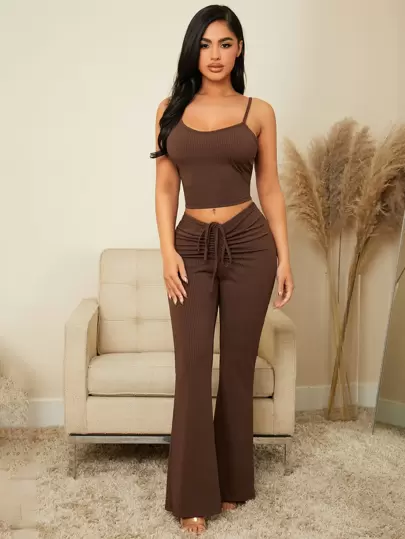 罗纹针织吊带上衣和褶饰抽绳裤休闲套装 - 咖啡棕 - 查看 1