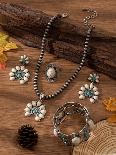 4 件套波西米亚风格时尚复古古铜色绿松石项链、耳环、戒指和手链首饰套装,适合服装搭配、日常和节日穿着 - 白加藍 - 查看 4