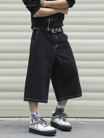 Claim Dot 大码男士口袋宽松阔腿休闲牛仔短裤 - 黑色 - 查看 1