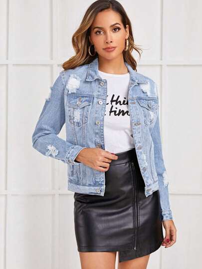 破洞前排扣牛仔夾克 - 淺色水洗藍 - 查看 1