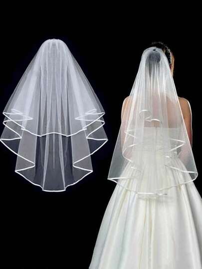 1 件双层简约新娘面纱,带缎面饰边,手工制作,适合婚礼,四季皆宜 - 白色 - 查看 1