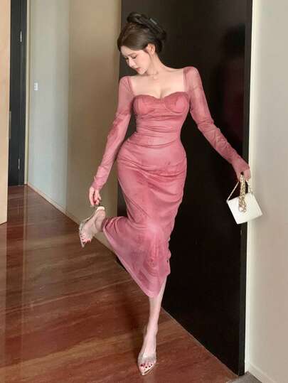 DAZY 全印花花卉情人节粉色蕾丝拼布中长款连衣裙,女士秋季连衣裙长袖连衣裙 - 西瓜粉 - 查看 10