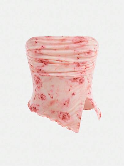 青少年女孩合身休闲简约舒适花卉不对称下摆背心 - 玫紅色 - 查看 1