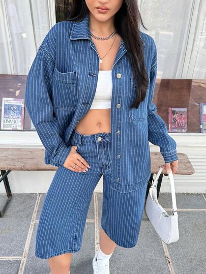 Rivivi 女士时尚条纹长袖水洗牛仔衬衫 - 深色水洗藍 - 查看 4