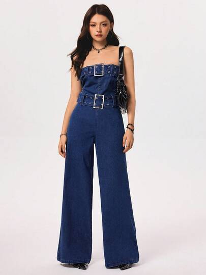 Rivivi 女式时尚挂脖牛仔连体裤 - 深色水洗藍 - 查看 1