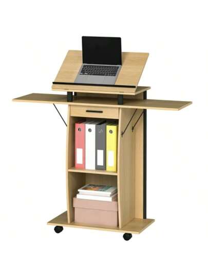 Rolling Podium Stand, Lectern With Folding Side Wings, Laptop Table With Drawer And Shelves, Oak Look - 卡其色 - 查看 1