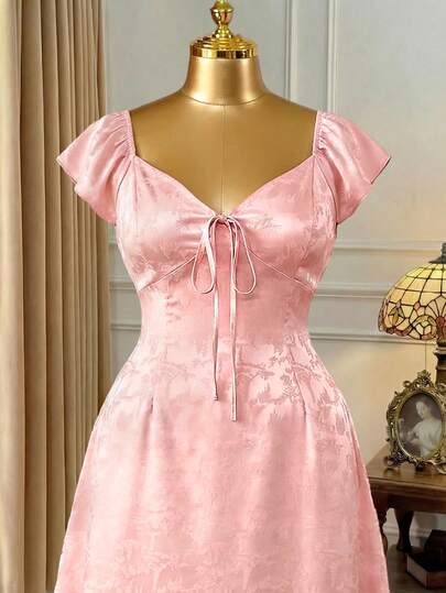 Rometta 大码女装夏季新款粉色提花V领荷叶边收腰优雅长裙,适合休闲、约会、晚宴、下午茶等场合。