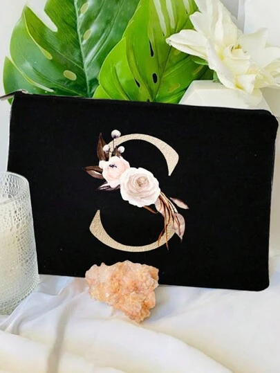 玫瑰花和字母印花旅行化妝包,1個大容量輕量級化妝用品手提袋沐浴袋,多功能化妝品組織器,可愛的手提錢包袋,便攜式化妝品刷子收納手拿包,拉鍊關閉,適用於口紅、刷子、護膚品、手機、、小物品,家用、旅行、度假和學校使用 - 彩色 - 查看 1