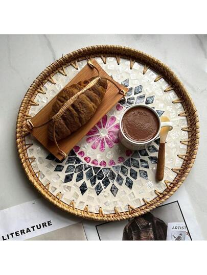 圆形藤条托盘 藤条餐具托盘 带木质底座 装饰性多色篮子 用于餐桌装饰、储存和摆放咖啡、面包、食物、水果 圣诞礼物 - 彩色 - 查看 1