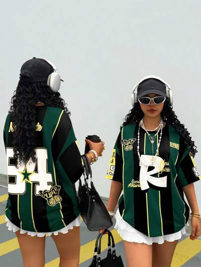 Rovax 女士对比条纹数字印花短袖 T 恤 - 墨綠色 - 查看 1