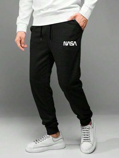 RueChic 男式棉质字母图案抽绳腰带运动裤 - 黑色 - 查看 1