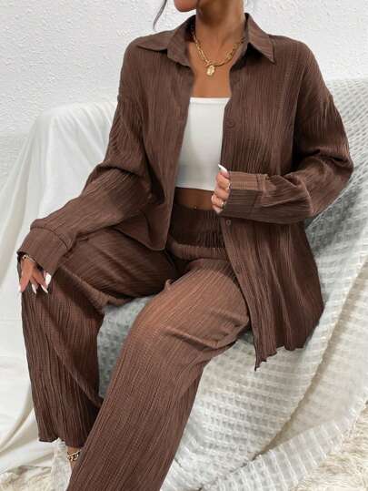 RueChic 落肩袖襯衫和褲子 - 咖啡棕 - 查看 1