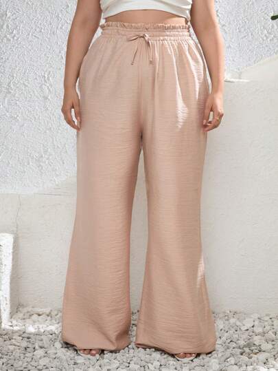 大尺碼女士米色麻質褲子,附帶腰帶細節