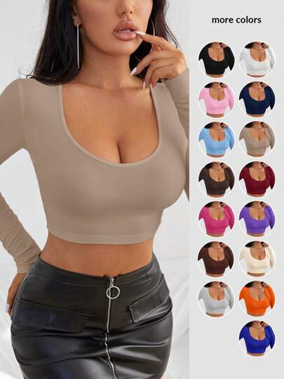 SHEIN SXY 纯色修身短款 T 恤音乐会长款夏季风情舞会性感情人节基本款 T 恤 - 卡其色 - 查看 6