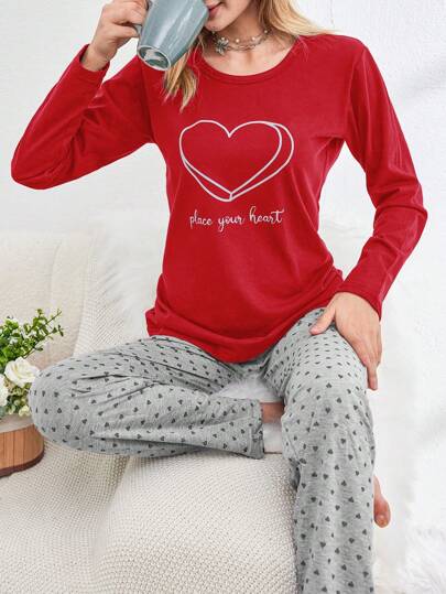 RueChic 女士字母印花圆领长袖休闲上衣和裤子两件套 - 紅色 - 查看 1