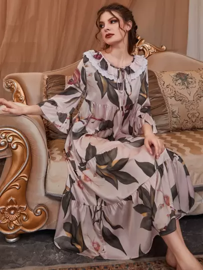荷葉邊領口荷葉袖滿身花卉緞面睡裙 - 彩色 - 查看 1