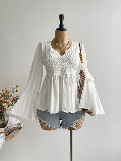 Rusttydustty 白色休闲度假喇叭袖上衣,适合波西米亚风复活节海滩装扮、夏威夷音乐节和热带度假 - 白色 - 查看 1