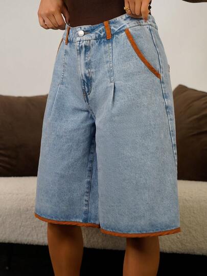 SAYEHFBABY 女式撞色边喇叭牛仔短裤 - 藍色 - 查看 6
