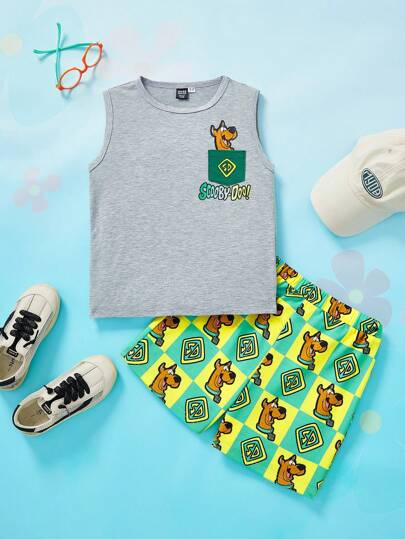 SCOOBY-DOO X SHEIN 少年男孩卡通圖形背心和短褲套裝 - 彩色 - 查看 1