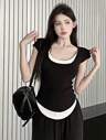女式针织船领纽扣装饰短袖T恤,夏季新款修身短款上衣