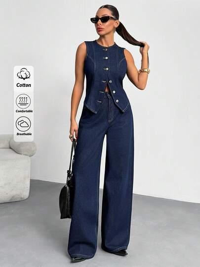 SHEIN 100%纯棉女士深色水洗牛仔背心和裤子两件套 - 深色水洗藍 - 查看 1