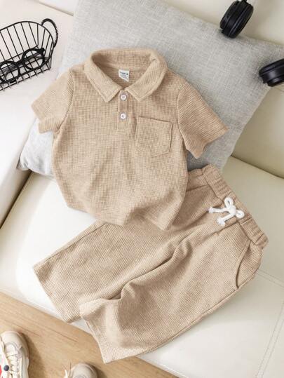 SHEIN 2 件装男婴有领短袖半拉链上衣和休闲裤套装 - 卡其色 - 查看 1