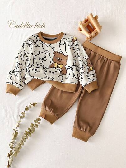 SHEIN 2 件套男婴幼儿 0-3 岁春夏休闲日常穿着叠穿熊印花圆领长袖运动衫 + 裤子套装 - 卡其色 - 查看 1