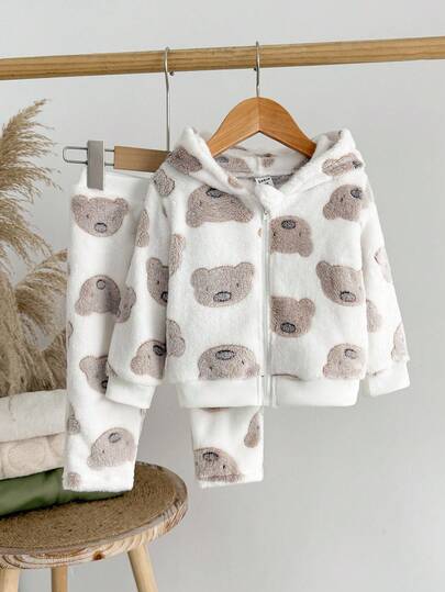 SHEIN 两件套男婴保暖羊毛熊套装 - 连帽拉链夹克 + 弹力袖口裤,秋冬 - 彩色 - 查看 1