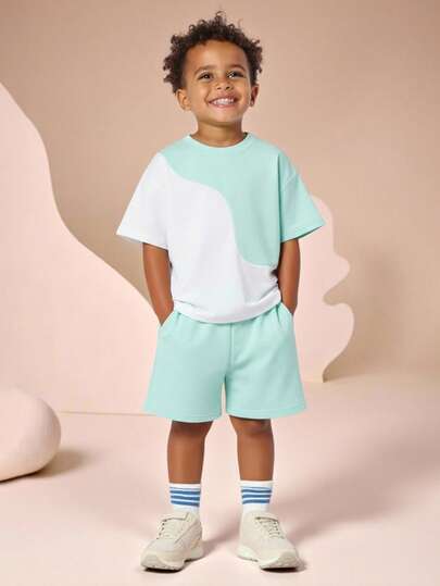 SHEIN 2件套儿童男童休闲日常舒适撞色圆领短袖T恤和短裤针织套装,适合上学、花园、海滩、生日、秋冬季节穿着。 - 彩色 - 查看 2