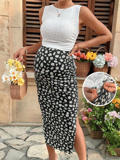 SHEIN 2 件孕妇休闲刺绣印花上衣和可调节腰部雏菊印花短裙套装 - 黑與白 - 查看 1