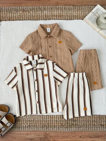 SHEIN 2件套男/女婴休闲可爱度假风条纹纯色短袖衬衫短裤套装,多件装,适合春夏穿着