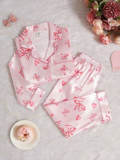 SHEIN 2 件套小女孩可爱蝴蝶结印花翻领开衫搭配休闲裤,舒适家居服 - 彩色 - 查看 1