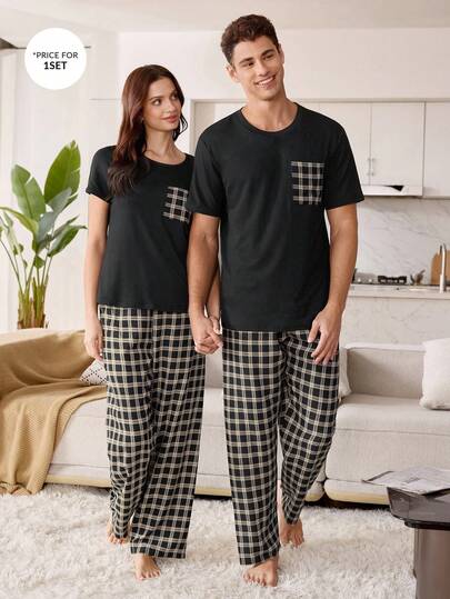 SHEIN 男士格子口袋圆领短袖睡衣套装(2件套),家居服 - 彩色 - 查看 1