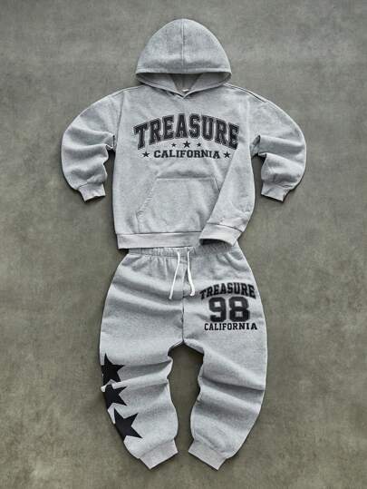 SHEIN 2 件套青少年男孩宽松图案连帽衫和运动裤套装 - 彩色 - 查看 10