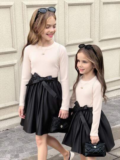 SHEIN 2 件套青少年女孩优雅休闲罗纹针织上衣 + 简约 PU 皮革腰裙(配腰带),秋冬 - 杏色 - 查看 4