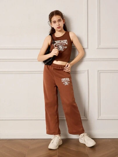 SHEIN 2 件套 青少年女孩运动休闲舒适设计图案印花吊带背心和紧身裤