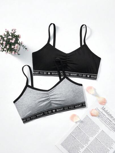 SHEIN 2 件装 Tween Girl 简约舒适褶皱文胸,带字母印花和弹性后背衬垫文胸套装 - 彩色 - 查看 1