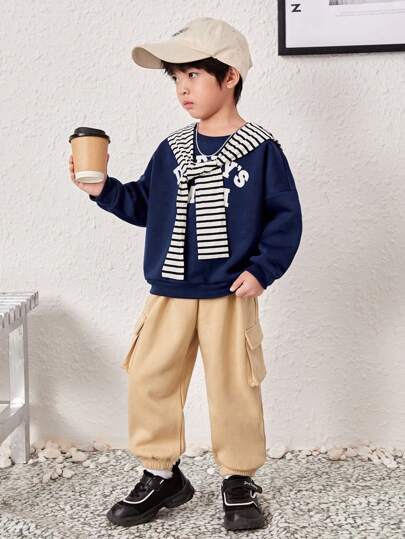 SHEIN 2 件套小男孩字母印花圆领运动衫,带口袋和条纹罗纹饰边,保暖内衬裤子套装,加厚 - 藏蓝色 - 查看 2