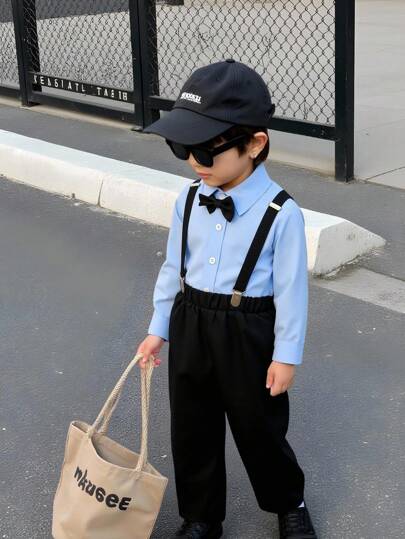 SHEIN 2 件套年轻男孩绅士服装套装,春/秋季,包括 1 件长袖翻领衬衫和 1 条带可调节吊带的及踝休闲裤,适合生日派对、婚礼、婚礼宾客、戒指持有人、花童