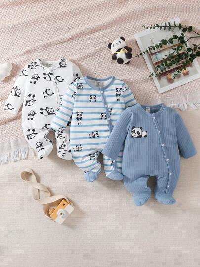 SHEIN 3 件套男宝宝休闲可爱熊猫条纹印花长袖连体睡衣