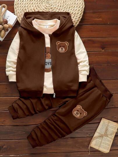 SHEIN 3 件套幼儿男童休闲熊连帽运动衫套装,秋季