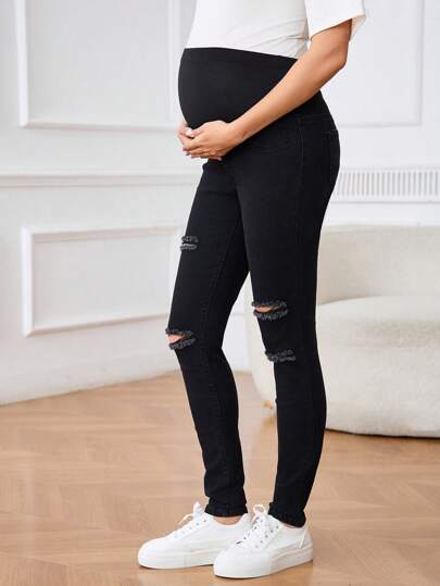 SHEIN 可调节腰部孕妇破洞紧身牛仔裤 - 黑色 - 查看 1