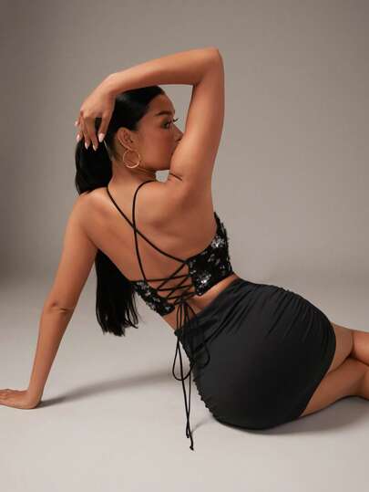 SHEIN BAE 聖誕亮片拼接露背交叉吊帶上衣 - 黑色 - 查看 4