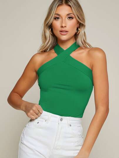 SHEIN BAE 素色十字交叉緊身繞頸上衣 - 綠色 - 查看 1