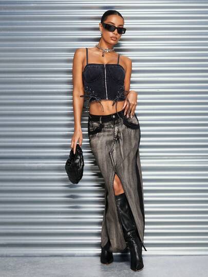 SHEIN BAE 炙熱女孩系帶裝飾牛仔上衣,女式 - 黑色 - 查看 1